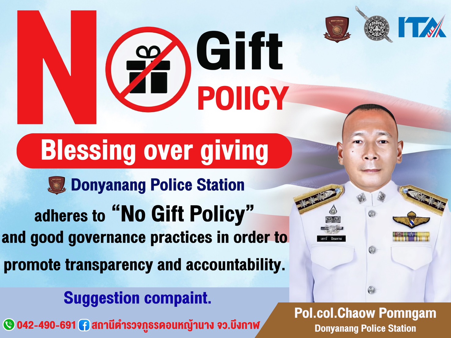 ทางสถานีได้มีการจัดทำอินโฟกราฟิกนโยบายไม่รับของขวัญและของกำนัด เพื่อเป็นการประชาสัมพันธ์แก่ผู้มารับบริการบนถสานี ณ จุดบริการ-จุดประชาสัมพันธ์